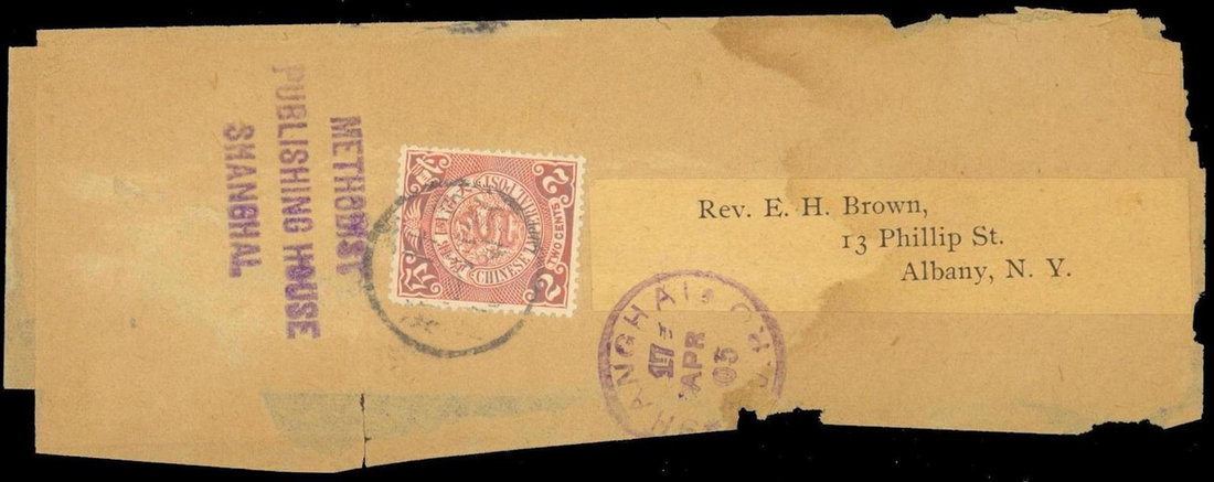 1905 (15 Apr.) newspaper wrapper from Shanghai to New York, franked with C.I.P. 2c., tied by "Kiangsu/ Shanghai' lunar c.d.s., "Shanghai/I.J.P.O" transit c.d.s.(17.4) in violet alongside, fine. Photo