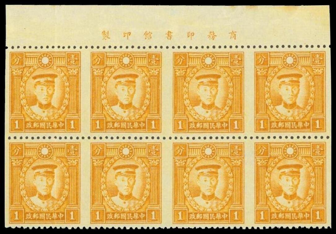 1939 Martyrs Hong Kong printing 1c. block of eight with imprint margin at top, variety imperforate vertically, fine unused. Chan 435a. Photo