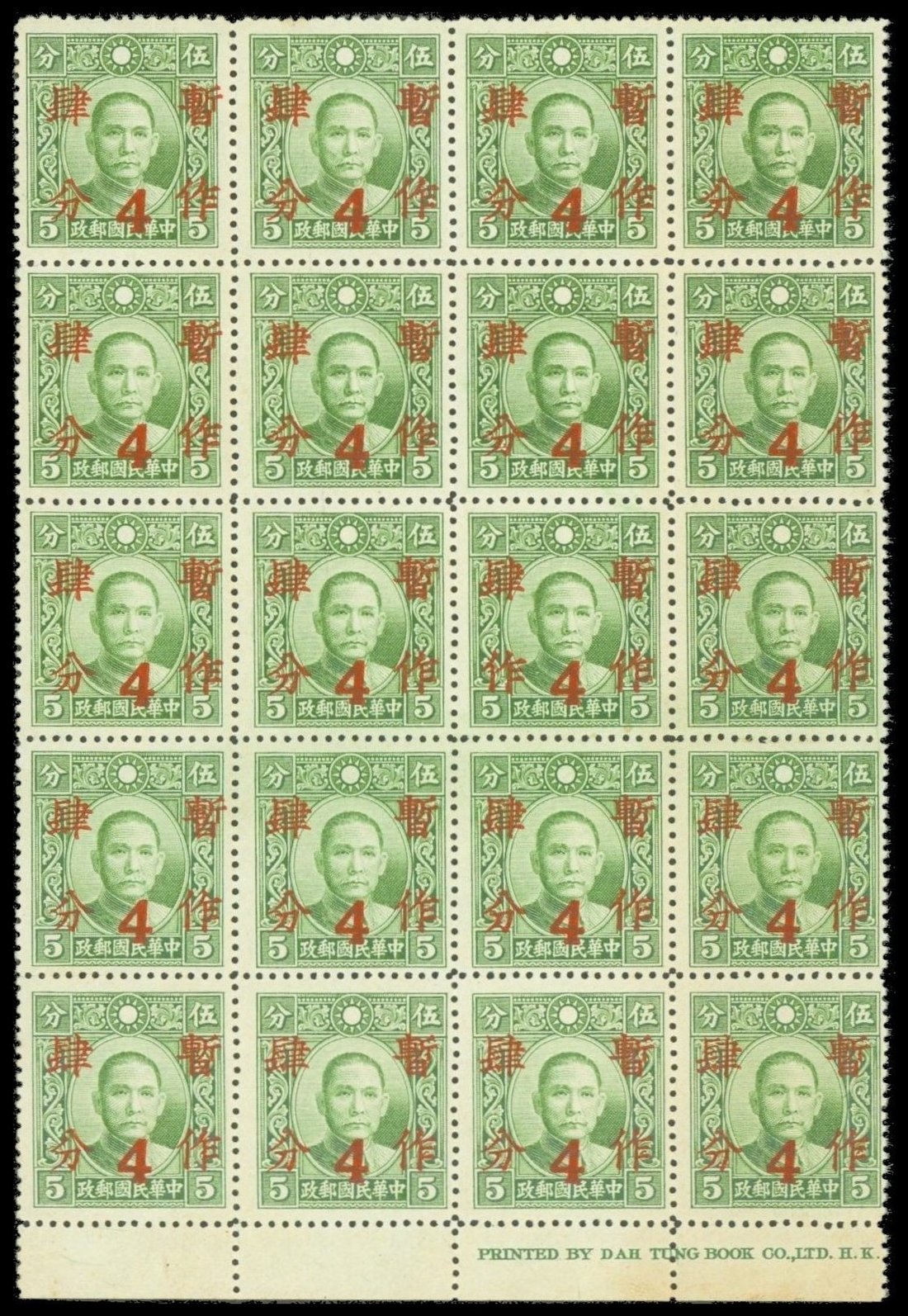 1940 surcharged in red 4c. on Dr. Sun Yat-sen 5c. green, block of twenty (4 x 5) from the foot of the sheet with imprint, one stamp variety lower left character "Tso" instead of "Fun", fine mint. Chan 480, a. Photo