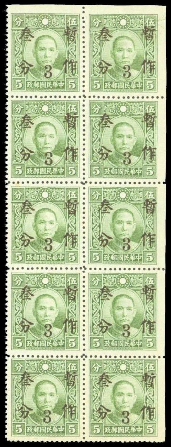 1940 Provincial surcharges East Szechwan 3c. on 5c. Dr. Sun Yat-sen Dah Tung printing, block of ten (2 x 5), variety imperf. at top and at right, fine and fresh unmounted. Chan 483var. Photo