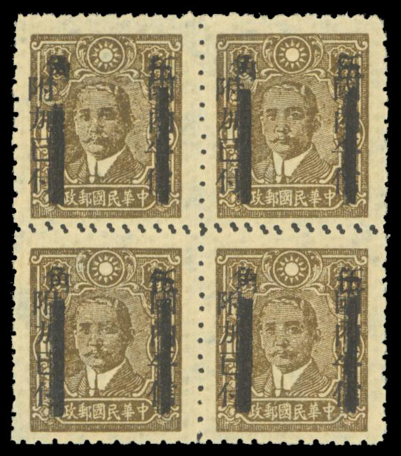 1943 surcharge of 50c. with two vertical bars in black for Kwangsi on 16c. olive-brown, perf. 11 x 13, block of four, fine to very fine unused without gum as issued. Chan 669e. Photo