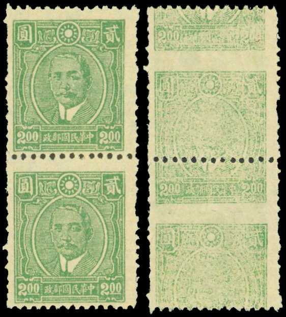 1945-46 Dr. Sun Yat-Sen Chungking Dah Tung print $2 green vertical pair, varieties printed on both sides and stamp design on back side misplaced significantly, fine unused, rare. Chan 841a var. Photo