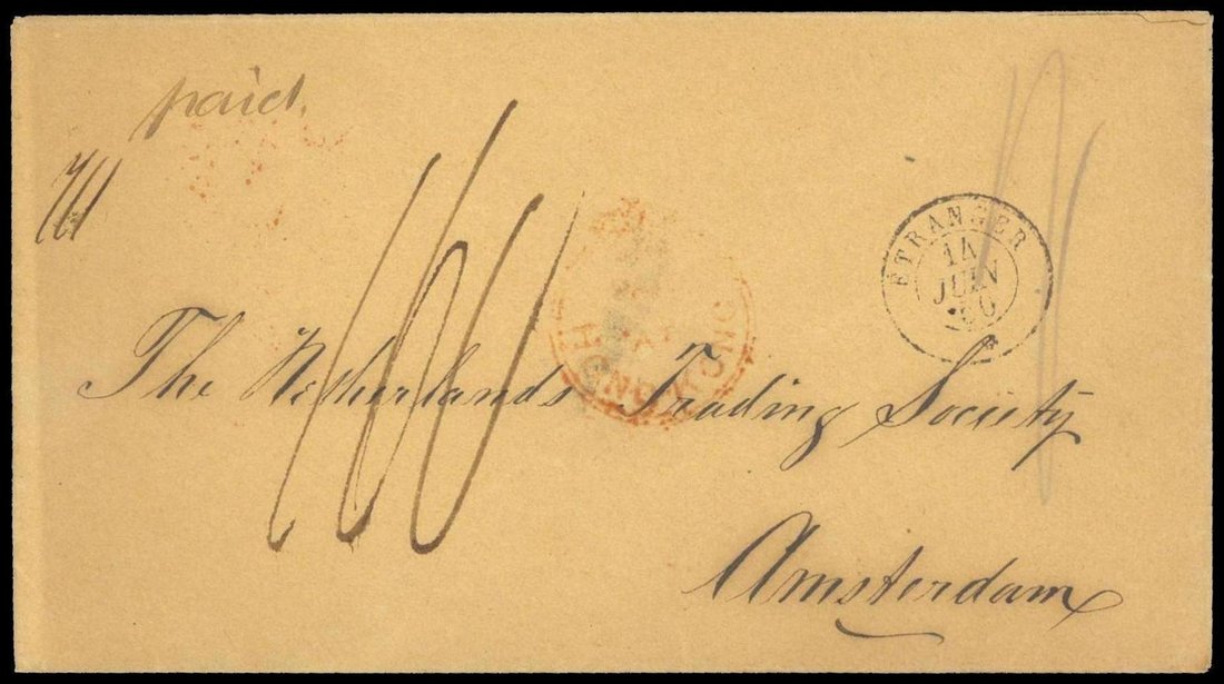1850 (23 Apr.) stampless envelope to Amsterdam (16.6) via Etranger (14.6), on reverse tied by "Hong Kong" double-arch d.s. (Webb type 9); and on front tied by "Paid At Hong Kong" medium-crowned c.d.s. (Webb type 8), very fine. Photo