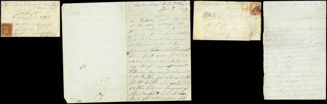 1857-58 a part correspondence from a carpenter on H.M.S. 'Niger' whilst stationed off Canton or Hong Kong with 1857 (9 June) envelope and letter to his parents in Rochdale, countersigned by the commanding officer and bearing G.B. 1d. stars tied by London numeral; with the original letter (with transcript) giving some details of the battle. Another envelope 1858 (24 Jan.) countersigned by the commanding officer to Rochdale bearing G.B. 1d. Stars cancelled by London number with the original letter (and transcript), two other letters home to his parents and hand-delivered local envelope addressed to James Emmett on H.M.S. 'Niger'. Condition is quite mixed but an interesting group with some additional background information. Photo