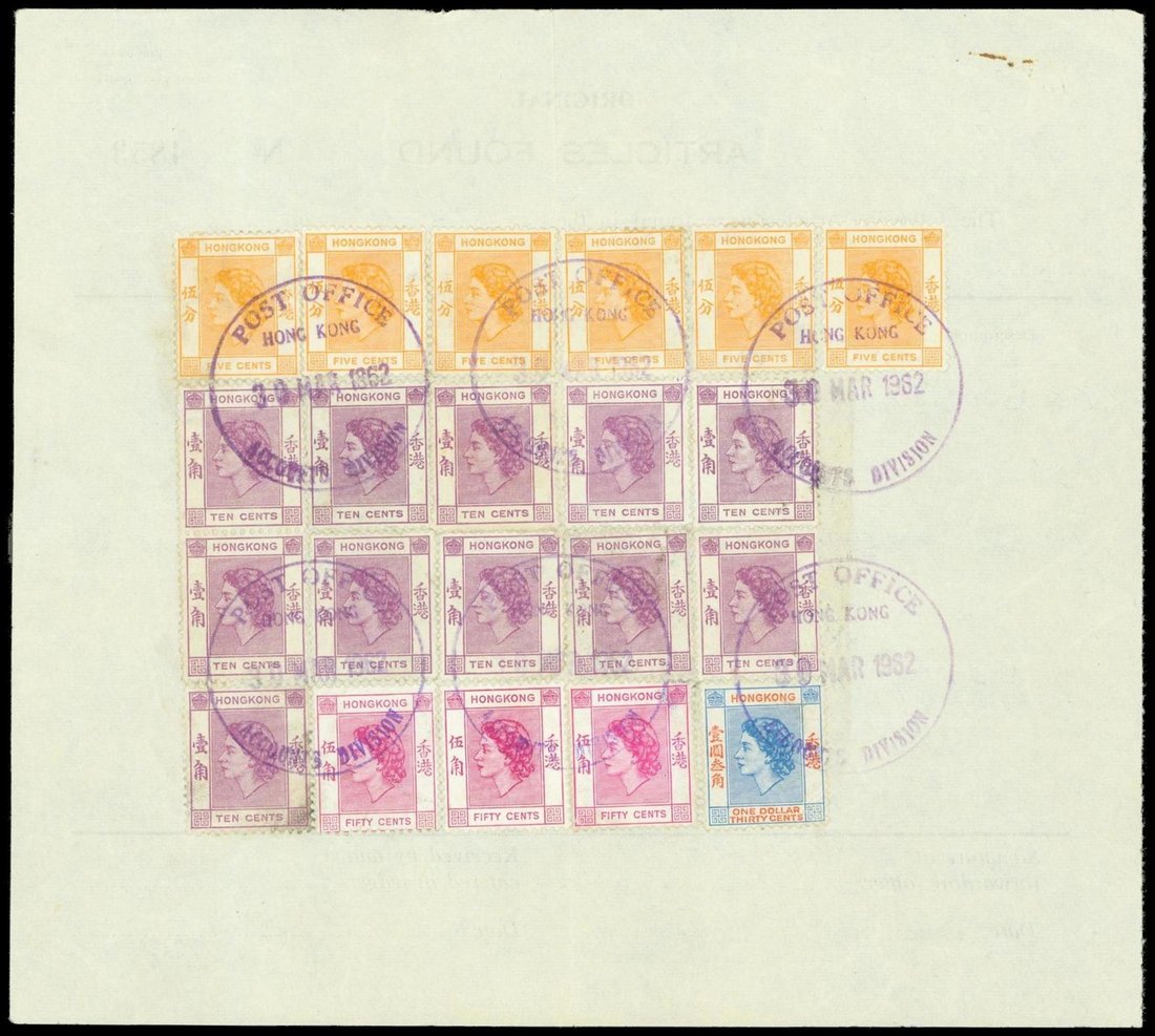 1962 (30 Mar.) An invoice receipt with QE first issue on reverse, 5c x 6, 10c x 11, 40c x 3 and a single $1.30, all tied by large single ring 'POST OFFICE/HONG KONG/ACCOUNTS DIVISION' in violet. Center folded. Photo