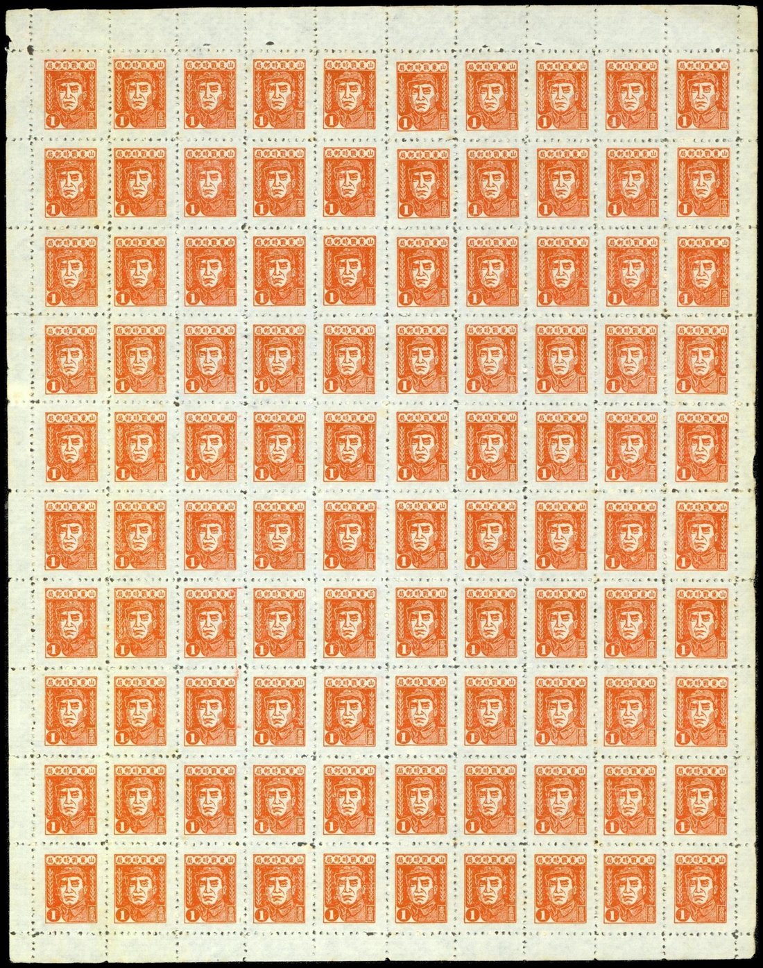 1945 Shantung War Time Post Chu Teh, perf. 10, complete sheet of one-hundred showing selvedge all around, unused without gum as issued, fine. Yang EC57. Photo