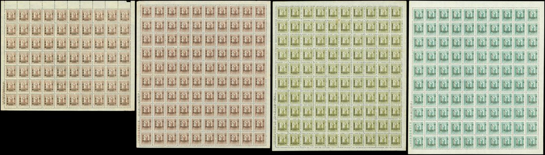1949 Sixth Surcharge on Chairman Mao, 5th print, $2500 on $1500 blue green, $20000 on $4500 purple brown and $35000 on $300 olive in complete sheets of one-hundred, also $20000 on $4500 in complete sheet of seventy, unused without gum as issued, fine. Yang NE158, 160, 161. Photo