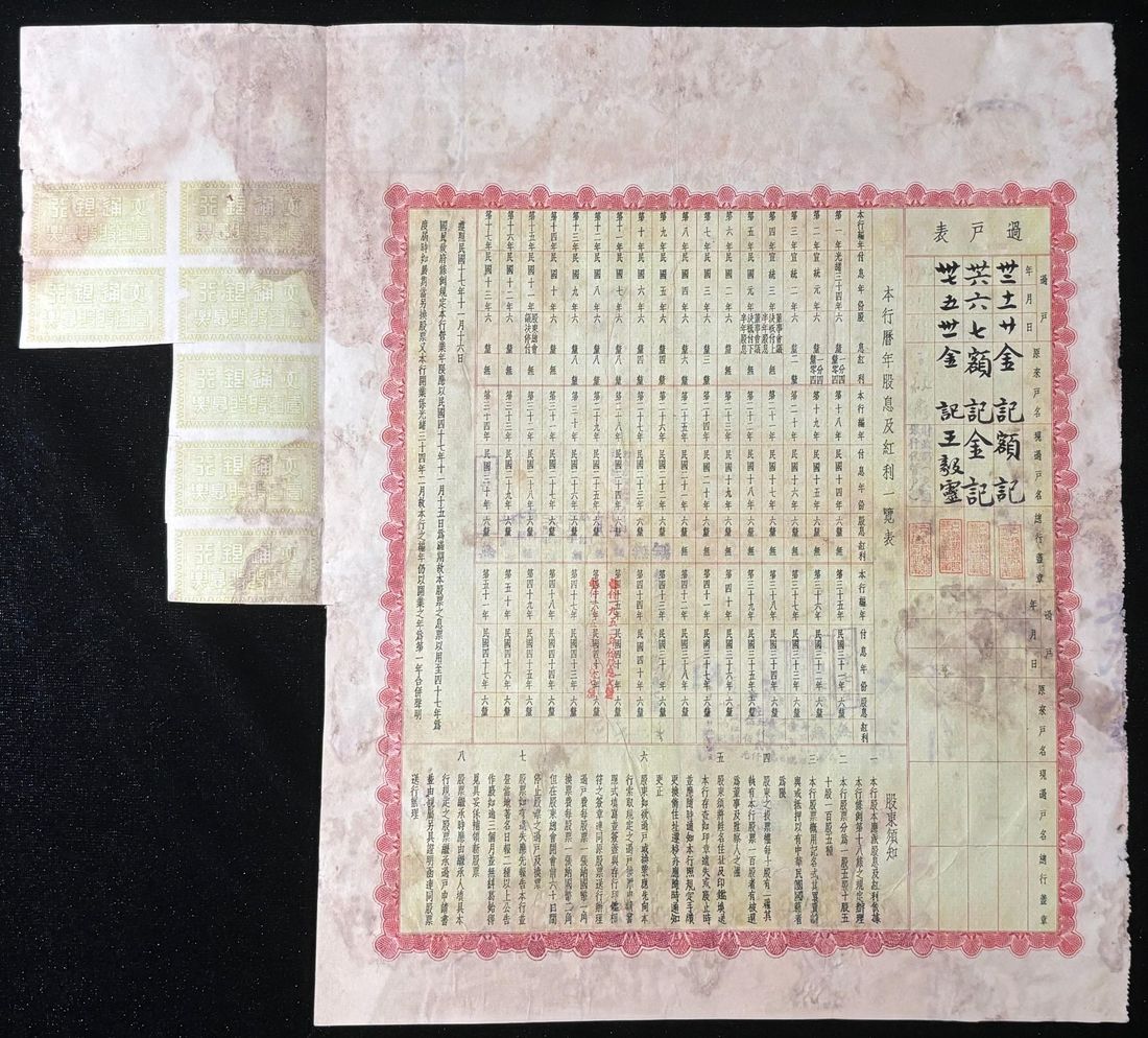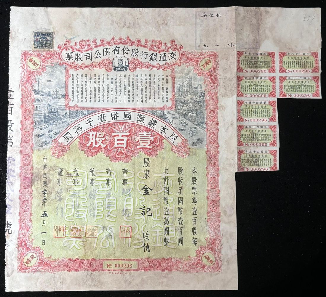 Bank of Communications, China, a certificate of 100 shares, Year 23 (1934), serial number 000296, repaired, fine. Quite rare nonetheless