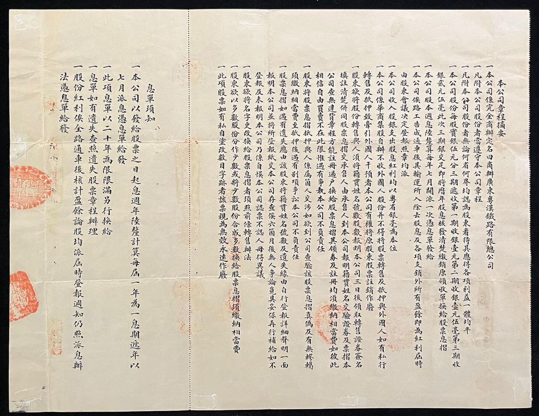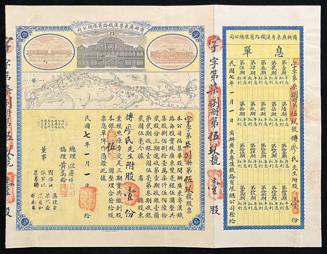 with interest counterfoil at right, very fine. An early certificate showcasing the significance of railway in the development of late Qing dynasty early ROC era. Very rare.