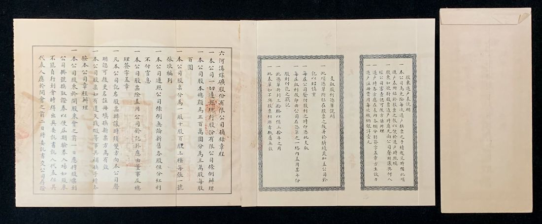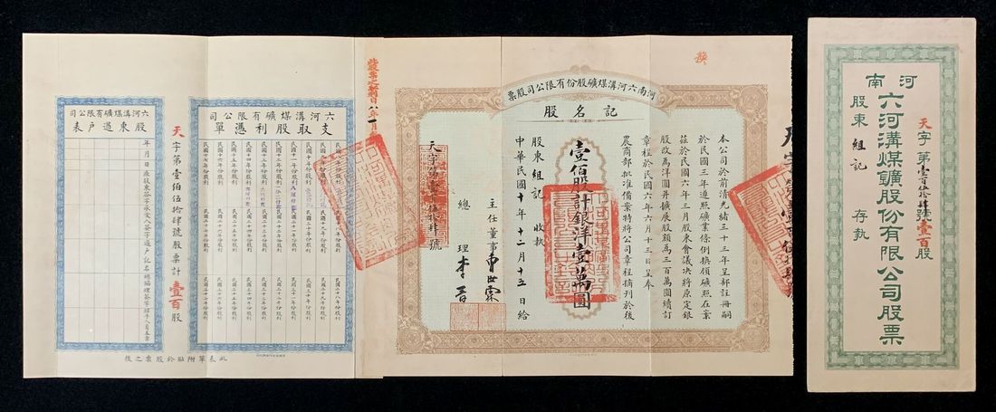 Honan Liu He Gou Coal Mine Company Limited, China, certificate of 10000 silver yuan for 100 shares, 1921, serial number 154, brown ornate border, pale blue underprint, black text, multiple red seals, attached with dividend slip,