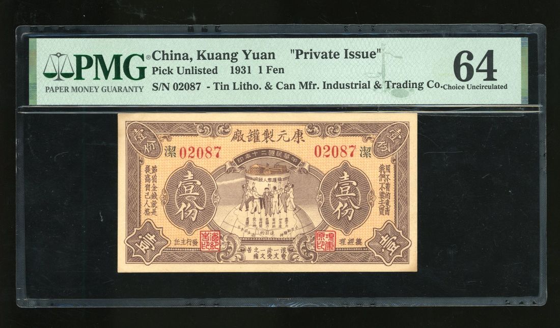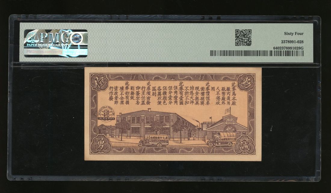 Kang Yuan Can Factory Ltd, China, 1 fen, Year 20 (1931), serial number 02087, brown, people standing on globe supporting factory within bowl, reverse factories. With imagery and various phrases encouraging saving and frugality.