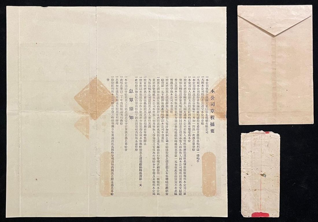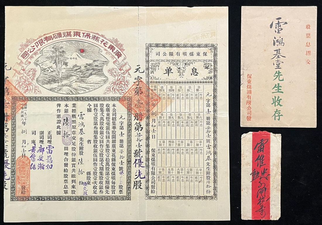 Po Tung Coal Mine Company Ltd., Hwa County, Kwangtung Province, a certificate of 60 shares, Year 8 (1920), a very attractive traditional Chinese design of village and stream with mountain and rising sun in the background, title in scrollwork, black, red 'chops', text all in Chinese, very fine.