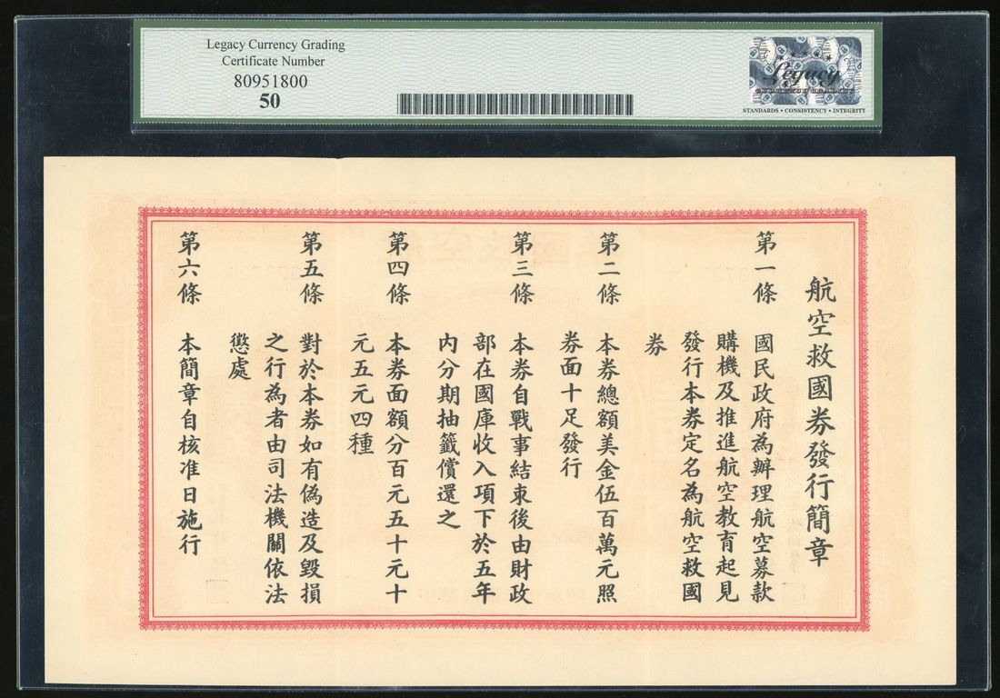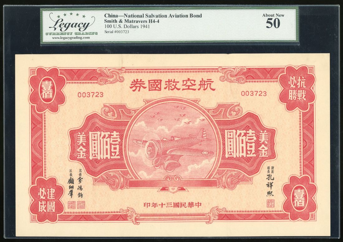 National Salvation Aviation Bond, China, US$100, 1941, serial number 003723, red, aircraft at centre, reverse Chinese text, embossed seal at bottom left,