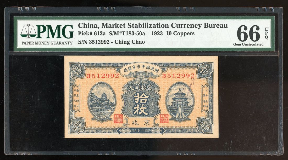 Market Stabilization Currency Bureau, China, 10 coppers, Year 12 (1923), Ching Chao, serial number 3512992, (Pick 612a), PMG 66EPQ. PMG census 2nd highest grade with only 11 better
