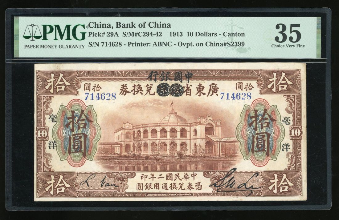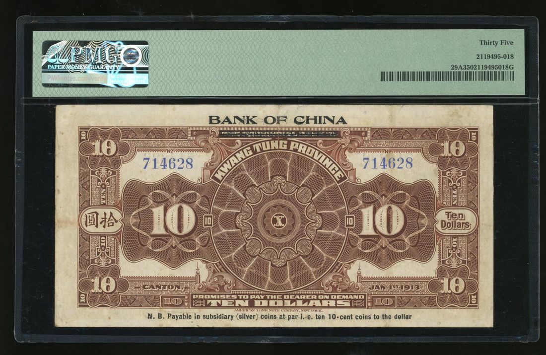Bank of China, 10 yuan overprinted on Provincial Bank of Kwangtung, Year 2 (1913), serial number 714628, black overprints over bank name on both sides, with terms at lower margin,