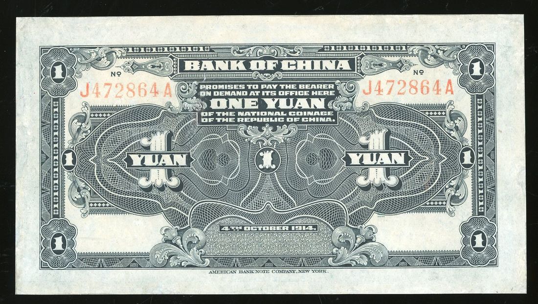 Bank of China, remainder 1 yuan, Year 3 (1914), serial number J472864A, (Pick 33r), repaired, extremely fine