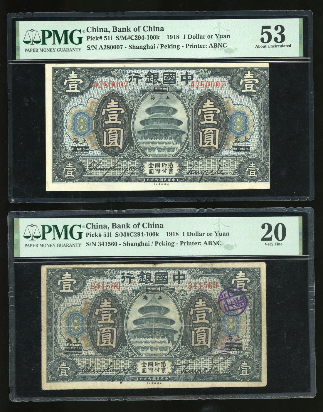 Bank of China, ERROR 1 yuan, Year 7 (1918), Shanghai overprinted on Beijing, serial number A280007, shifted printing error. Also with a normal issue for comparison to show both notes are the same size therefore it is indeed an error note, NOT trimmed as per PMG's comment.