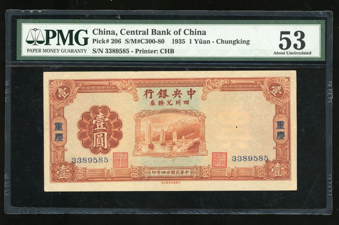 Central Bank of China, 1 yuan, 1935, Chungking, serial number 3389585, burnt orange on pale blue, sailing sampans at centre, 'Chungking' within left and right border,
