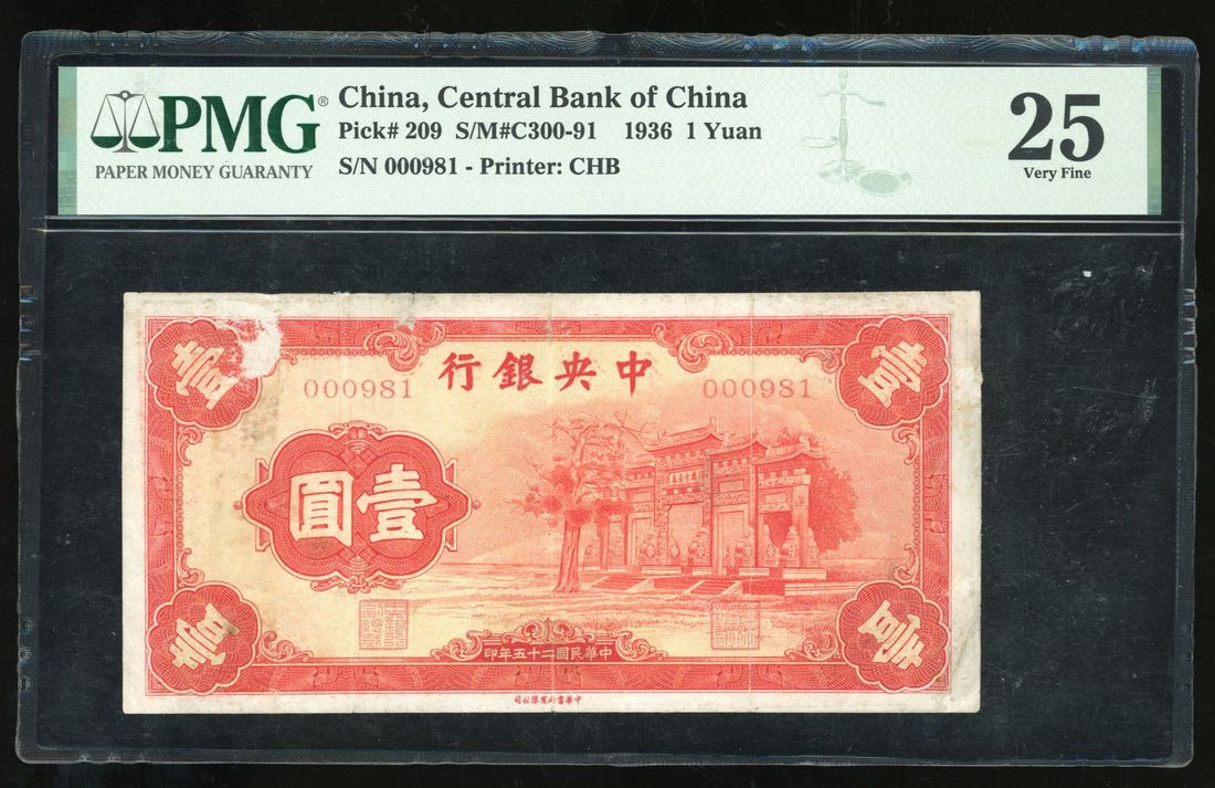 Central Bank of China, 1 yuan, Year 25 (1936), serial number 000981, (Pick 209), PMG 25, repaired, paper pull. Note this is much much scarcer "red monument" type.