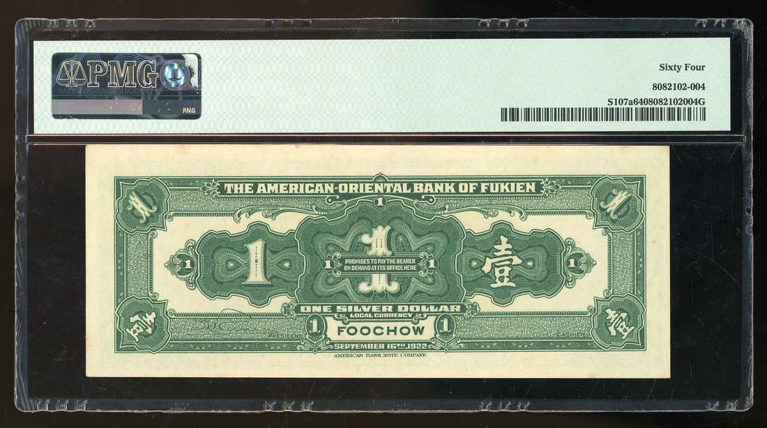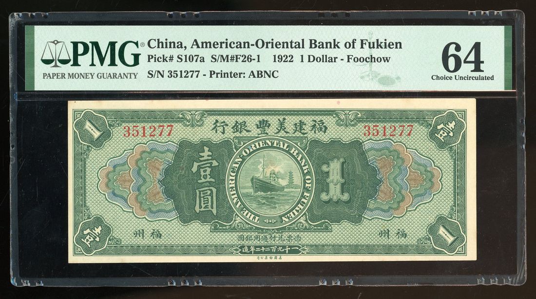 American-Oriental Bank of Fukien, China, 1 yuan, 1922, Foochow, serial number 351277, (Pick S107a), PMG 64.