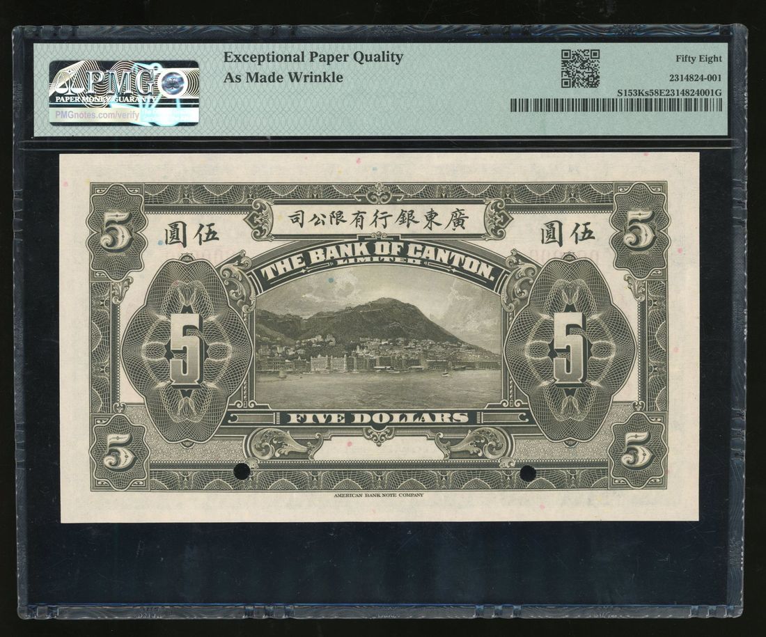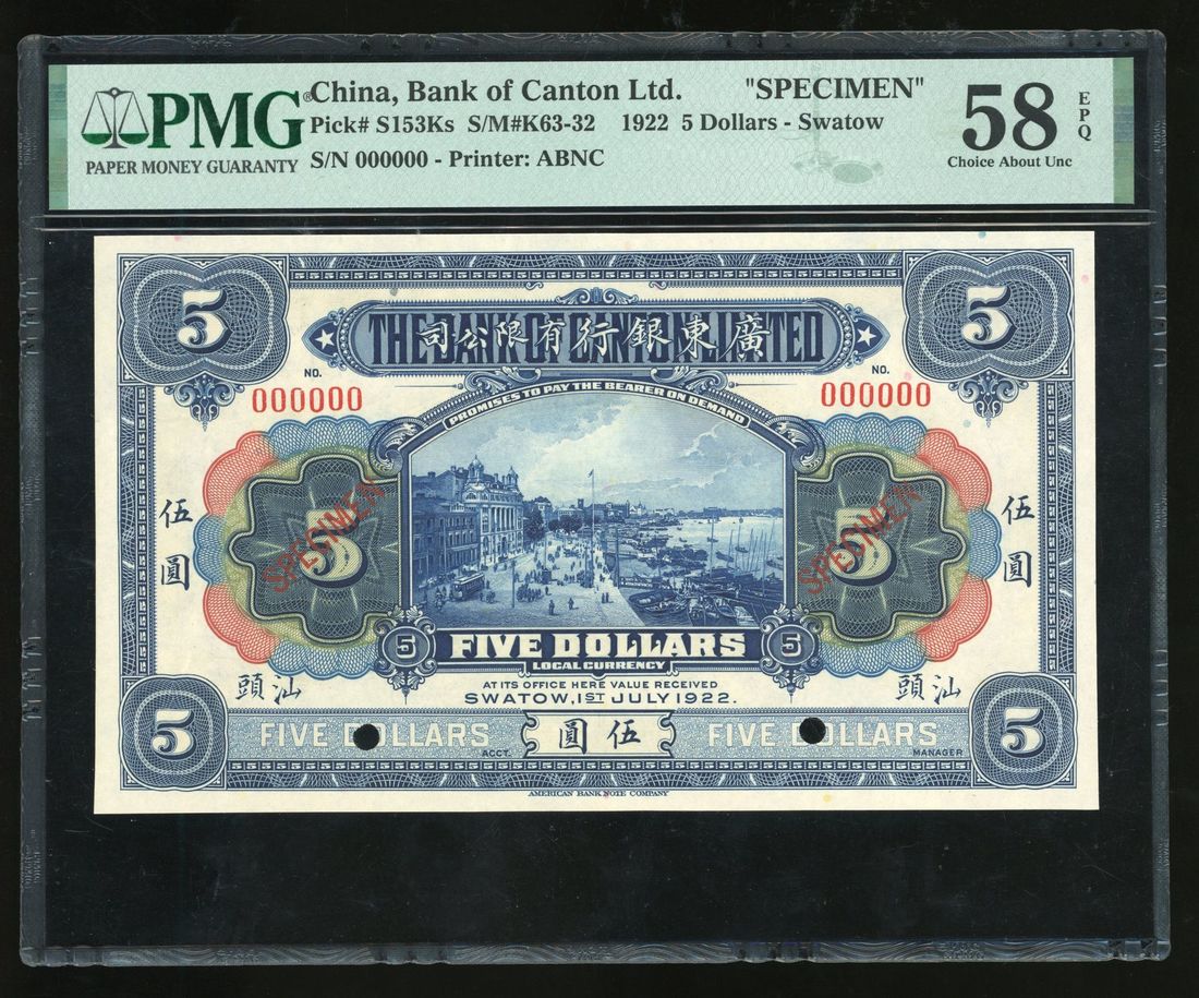 The Bank of Canton, China, specimen $5, 1922, Swatow, serial number 000000, blue on multicolour, Shanghai Bund at centre, reverse olive-grey, Hong Kong Island at centre,