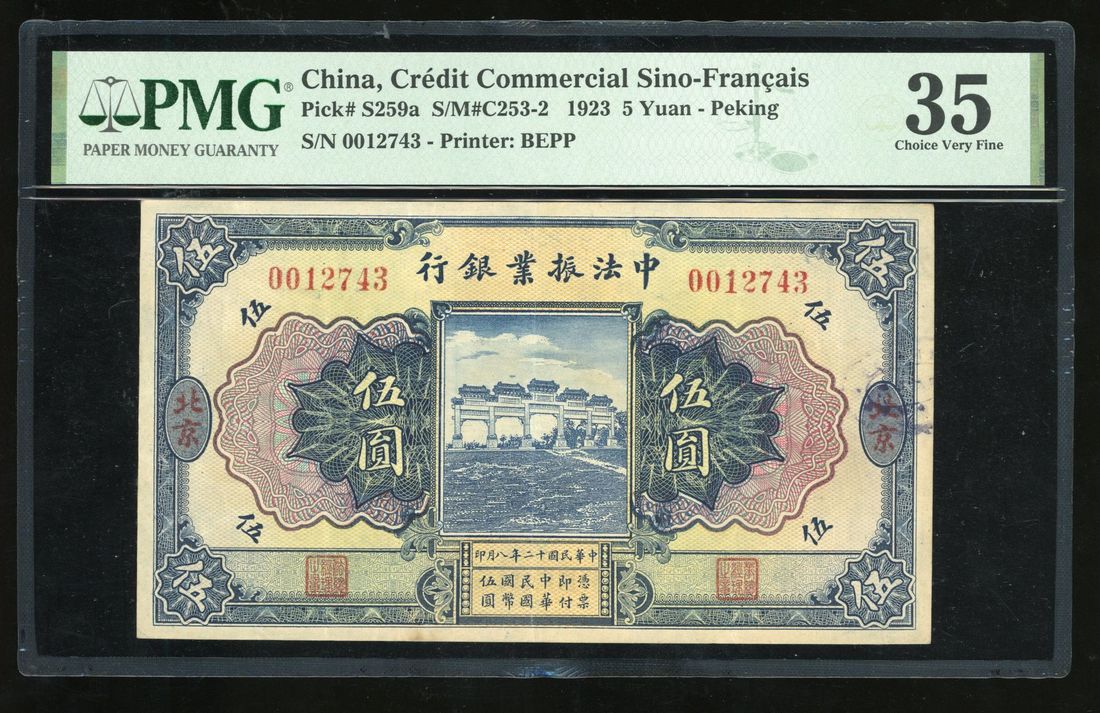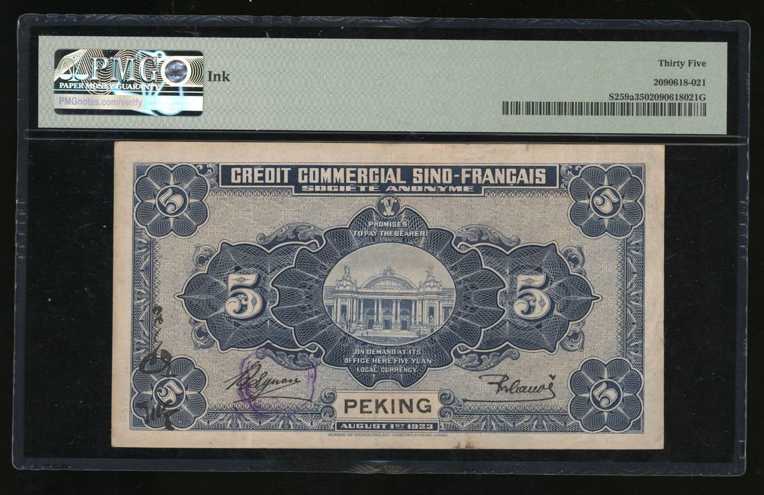 Crédit Commercial Sino-Français, China, 5 yuan, 1923, Peking, serial number 0012743, (Pick S259a), PMG 35, Ink. Only 7 examples present in the PMG population report and none finer than the current example. Generally a less often seen foreign bank. Scarce and highly desirable