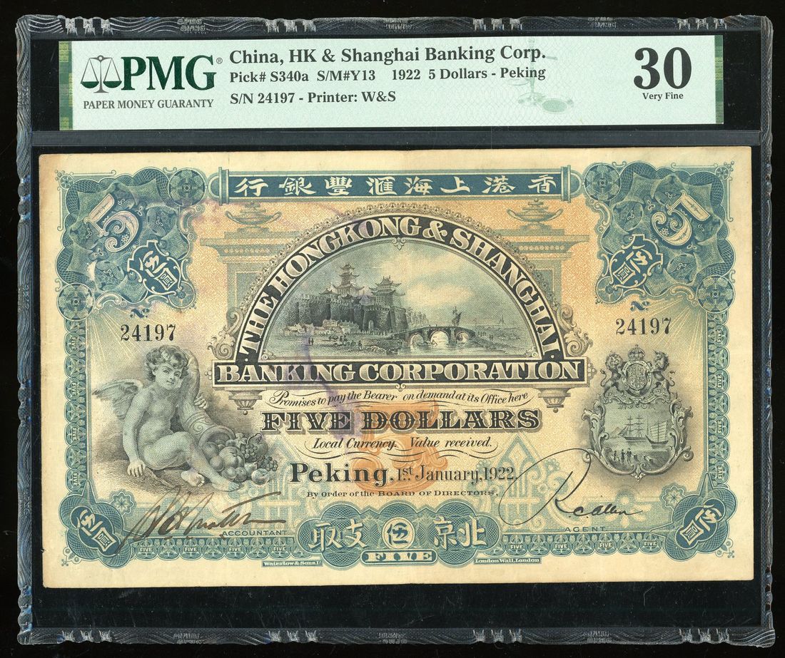 Hongkong & Shanghai Banking Corporation, China, $5, 1922, Peking, serial number 24197, teal on yellow, seated cherub with cornucopia at lower left, landscape scene with bridge, city walls and pagodas at upper centre, bank arms at lower right, reverse olive and brown, bank building at centre,