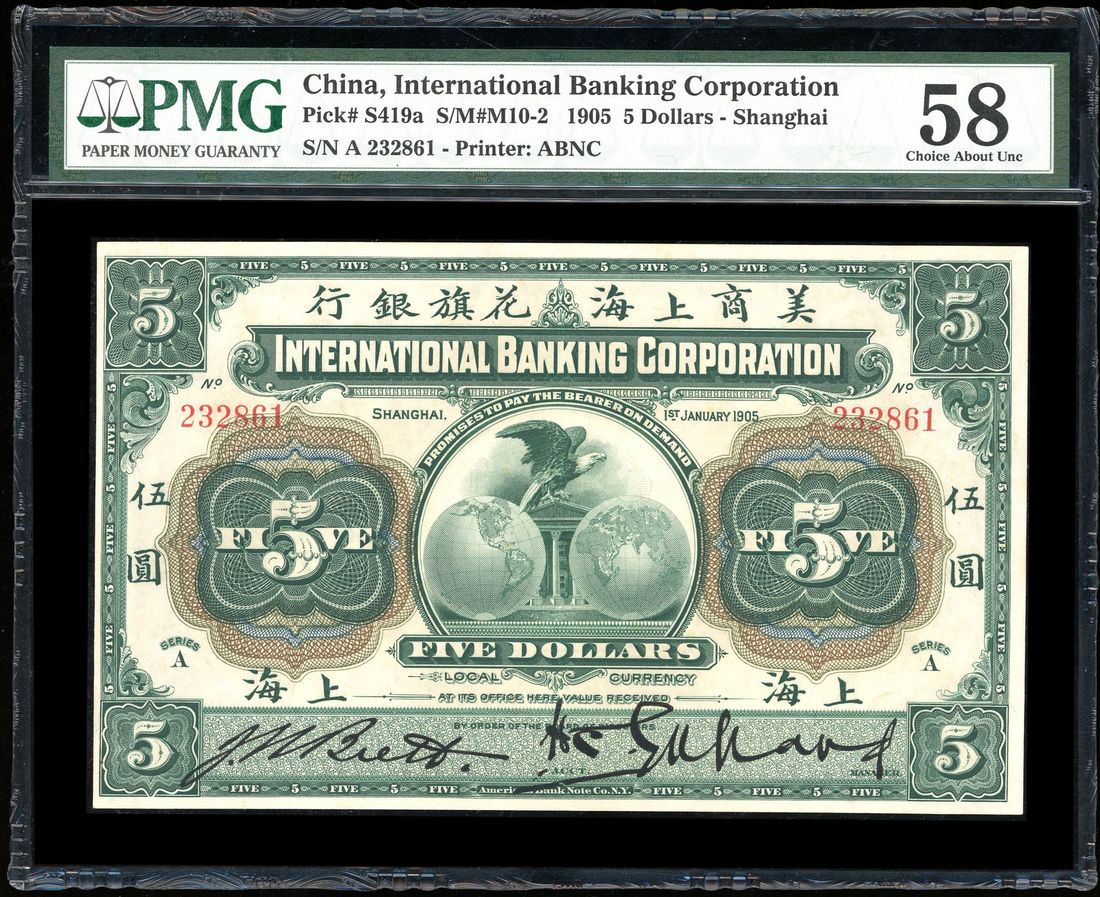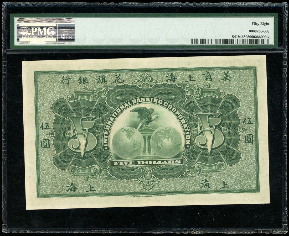 International Banking Corporation, China, $5, Shanghai, 1905, serial number 232861, green and multicoloured, eagle on globe at centre, reverse green,
