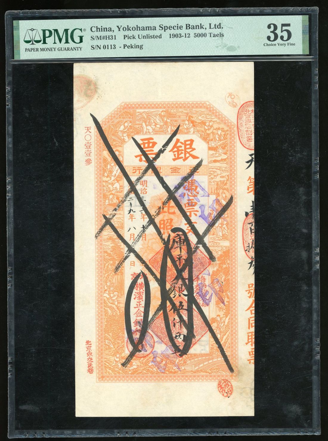 Yokohama Specie Bank Limited, China, 5000 Taels, 29th year of Guang Xu (1903), Peking, prefix Tian, serial number 0113,