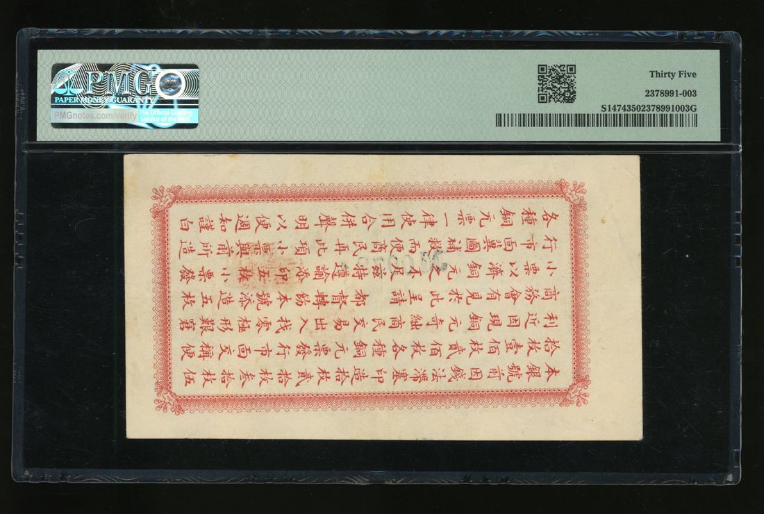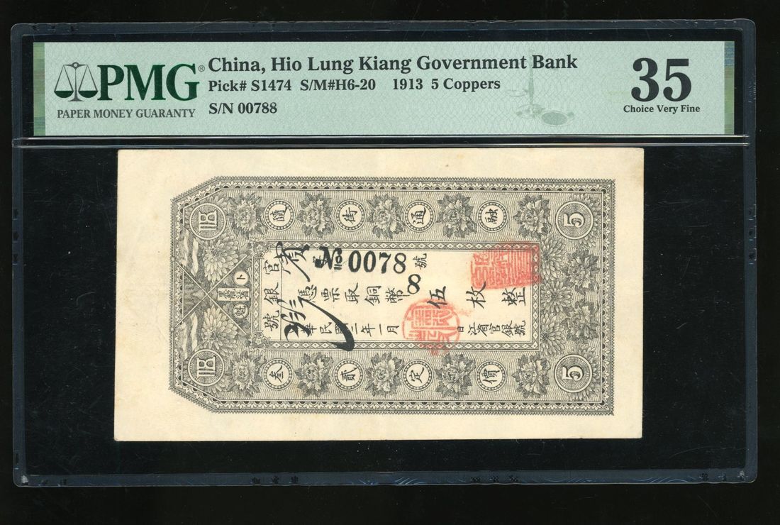 Hoi Lung Kiang Government Bank, China, 5 coppers, Year 2 (1913), serial number 00788, (Pick S1474), PMG 35. PMG census with only 4 better