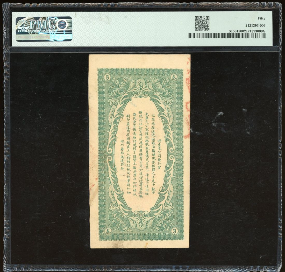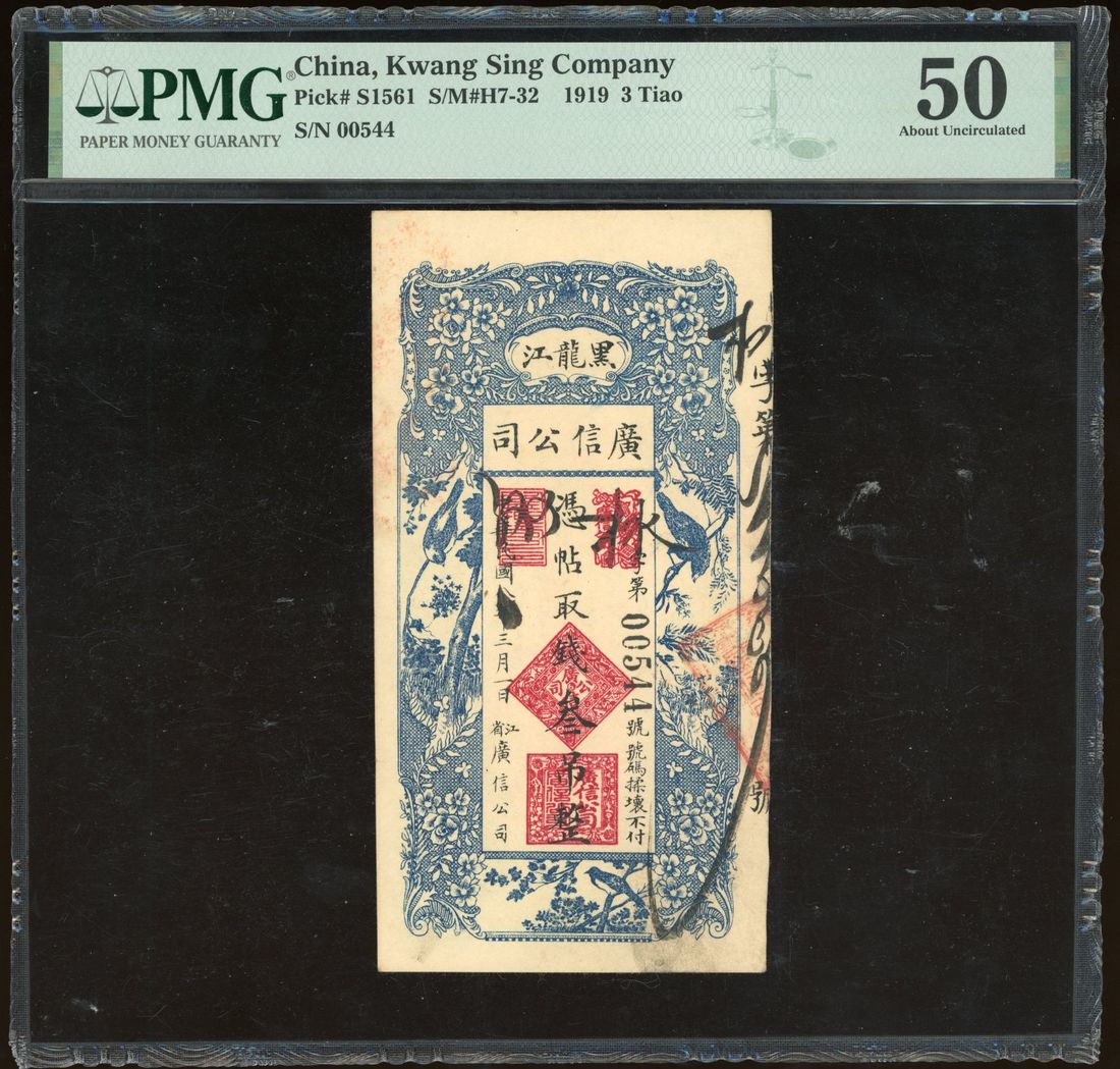 Kwang Sing Company, China, 3 tiao, Year 8 (1919), Bukui, serial number 00544, vertical format, blue and black, floral border, red handstamps at centre, reverse green,