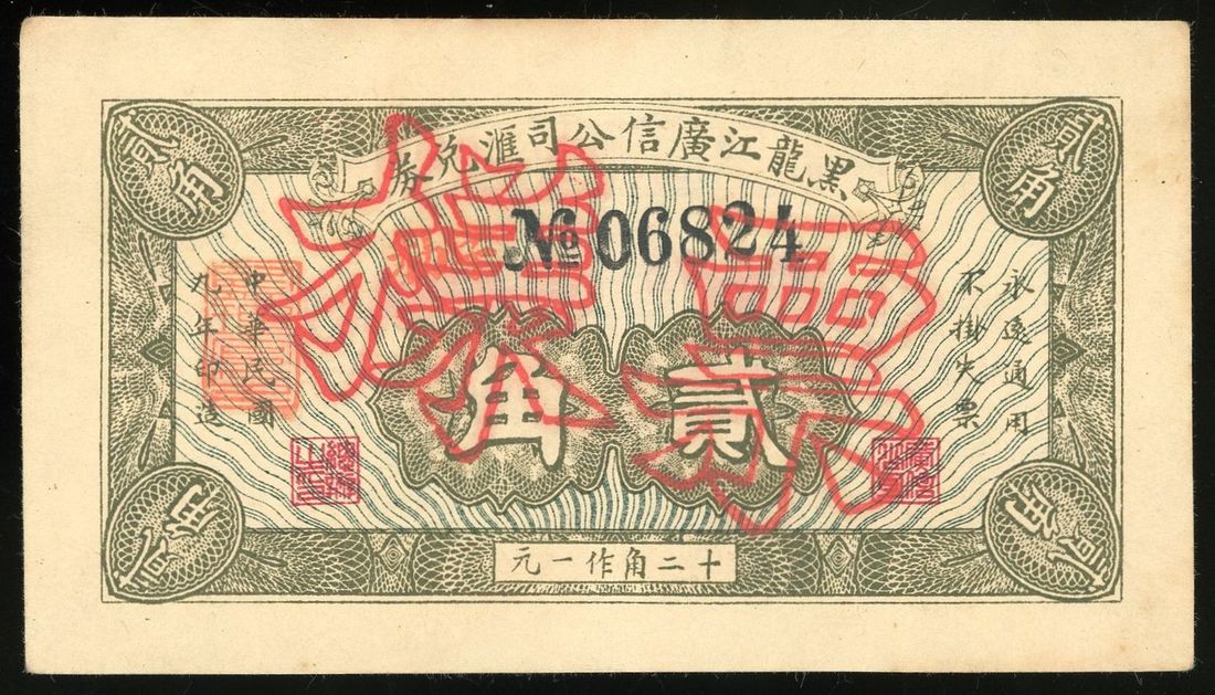 Kwang Sing Company, Heilungchiang, specimen 2 jiao, Year 9 (1920), serial number 06824, about uncirculated. Rare