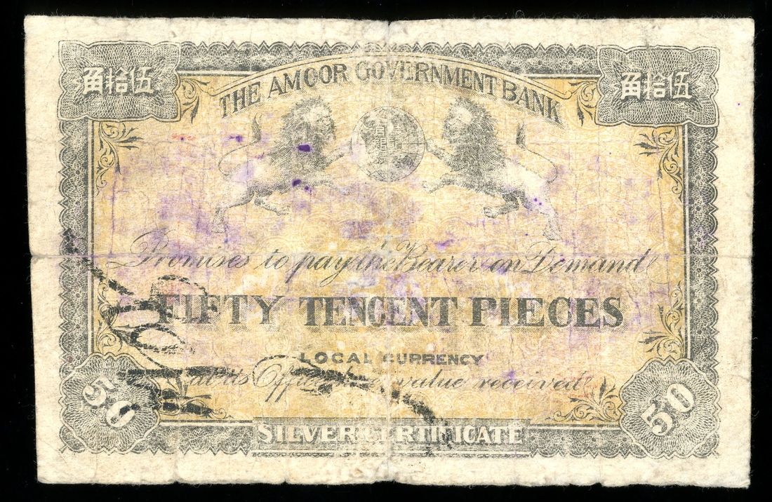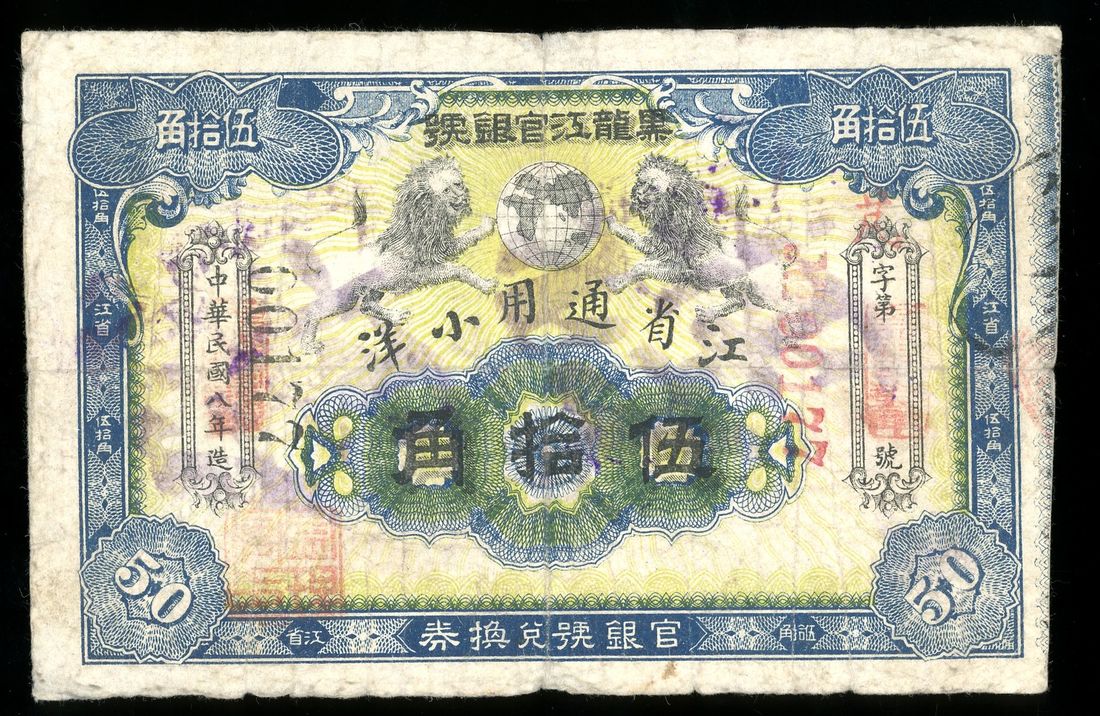 Amoor Government Bank, China, 50 tencent pieces = 5 dollars, Year 8 (1919), serial number 00177, (Pick S1653), repaired, previously mounted, fine. Nonetheless rare