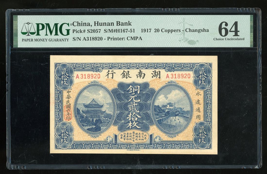 Hunan Bank, China, 20 coppers, 1917, Changsha, serial number A318920, (Pick S2057), PMG 64. Scarce in this high grade