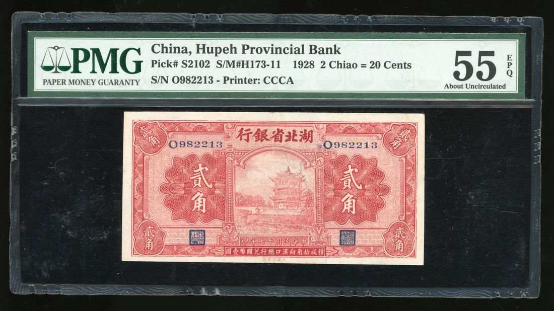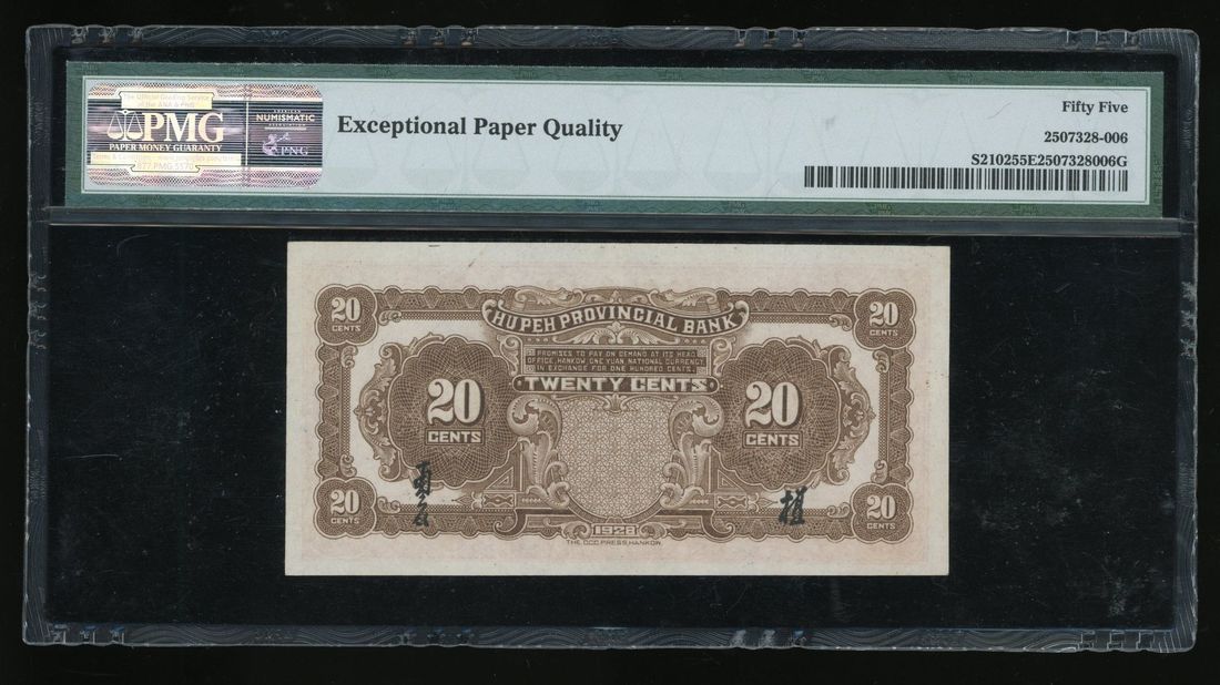 Hupeh Provincial Bank, China, 20 cents, Year 17 (1928), serial number O982213, (Pick S2102), PMG 55EPQ. With only 6 better examples with EPQ designation