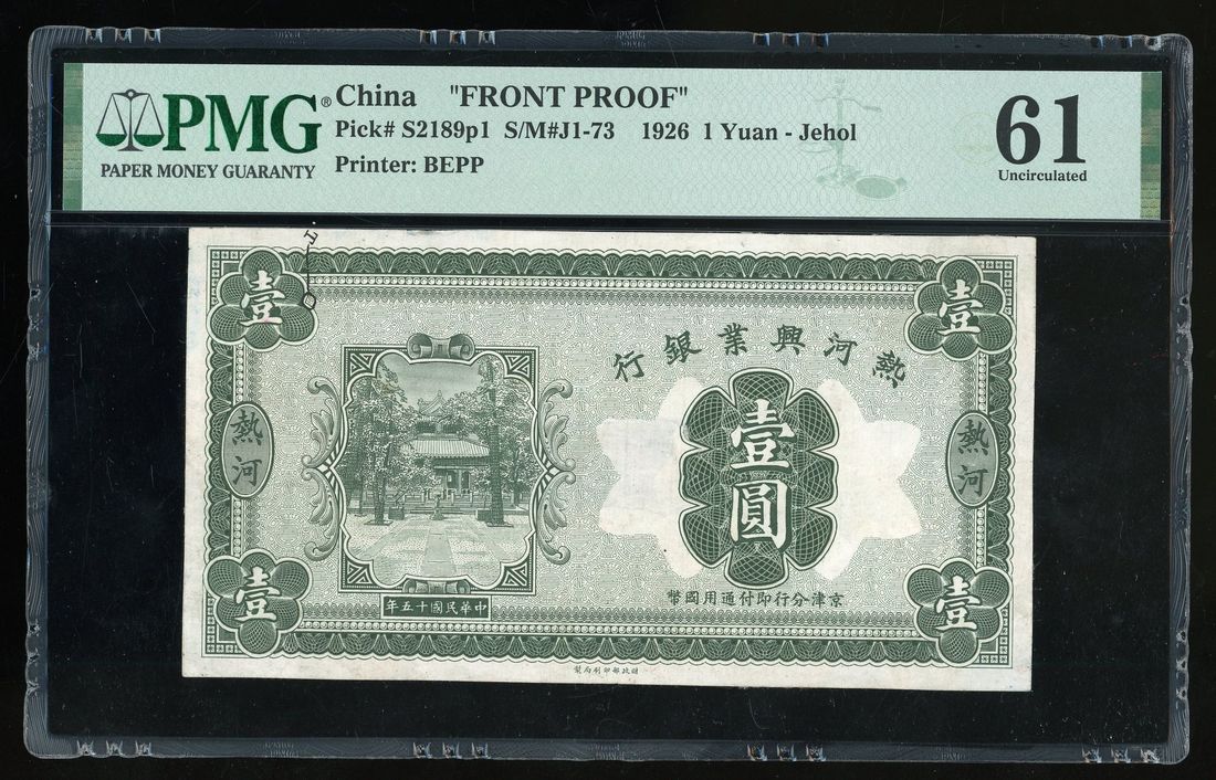 Industrial Development Bank of Jehol, China, obverse proof of 1 yuan, 1926, grey green, house at left,