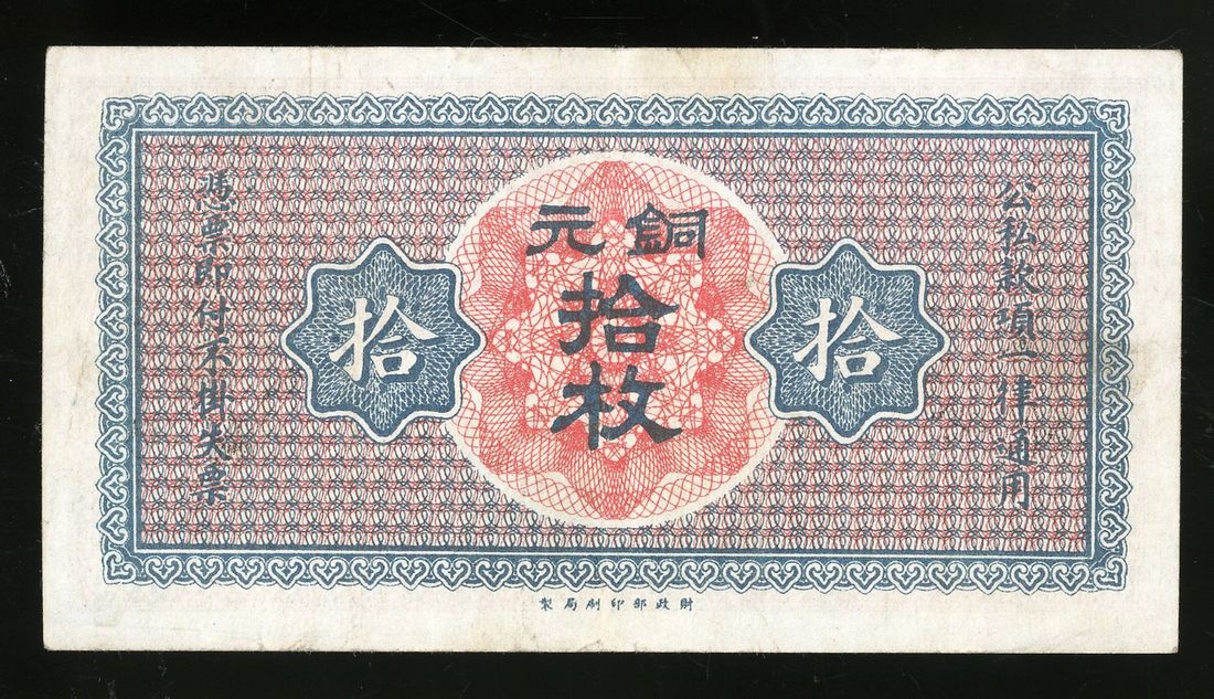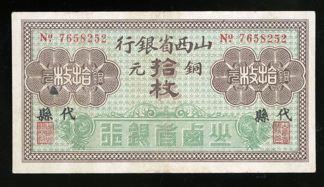 Shanse Provincial Bank, China, 10 copper coins, ND (1924), serial number 7658252, Dai Xian, (Pick S2633), unusual place issue. Dia Xian has long been a highly important military defensive outpost against the Mongols. Rare