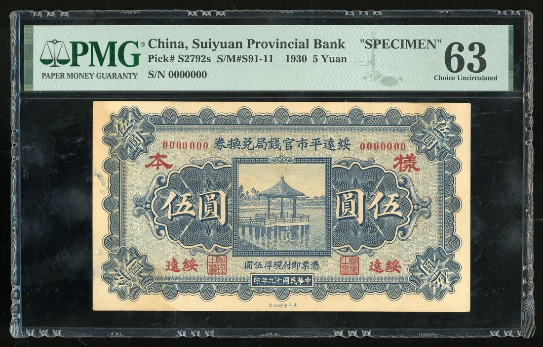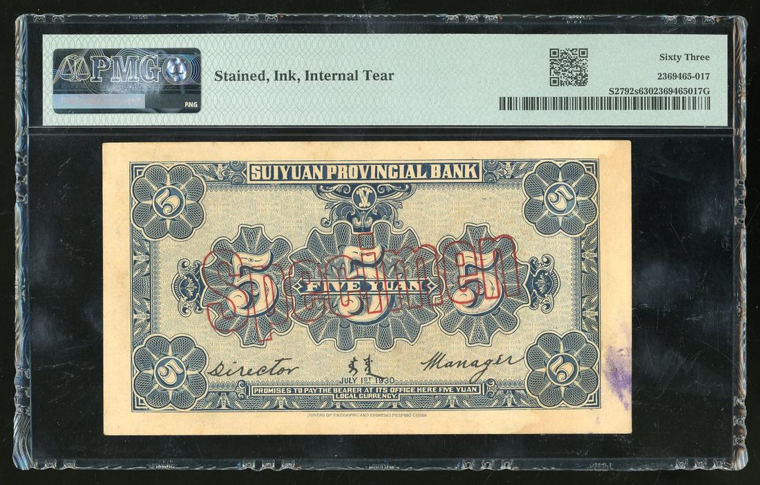 Siuyuan Provincial Bank, China, specimen 5 yuan, Year 19 (1930), serial number 0000000, (Pick S2792s), PMG 63, stained, ink, internal tear. Specimens highly unusual and especially in this high grade, PMG census only 3 better