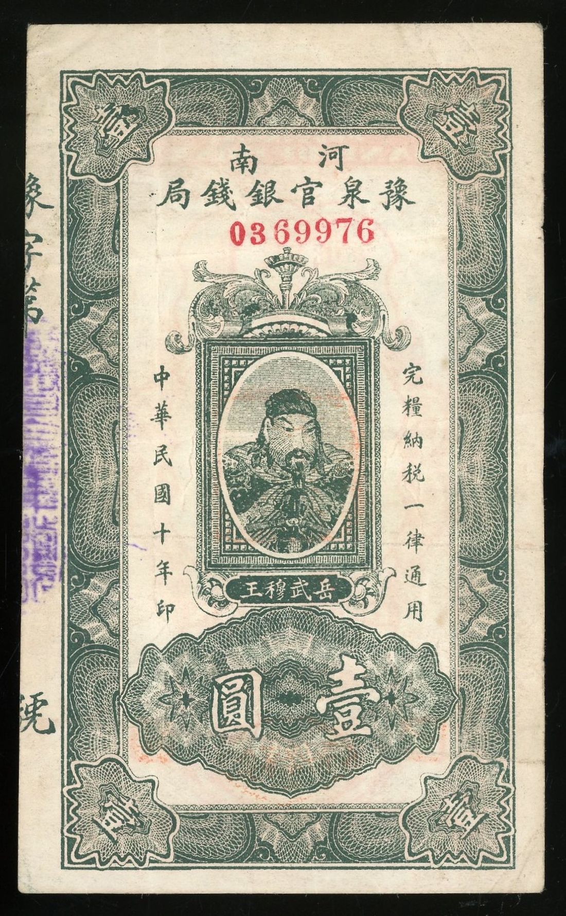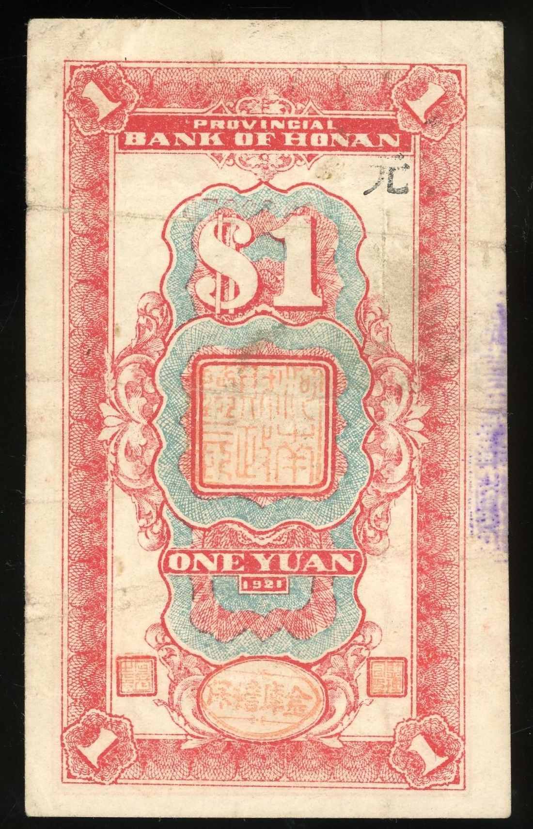 Provincial Bank of Honan, China, 1 yuan, Year 10 (1921), serial number 0369976, without red stamp at centre,