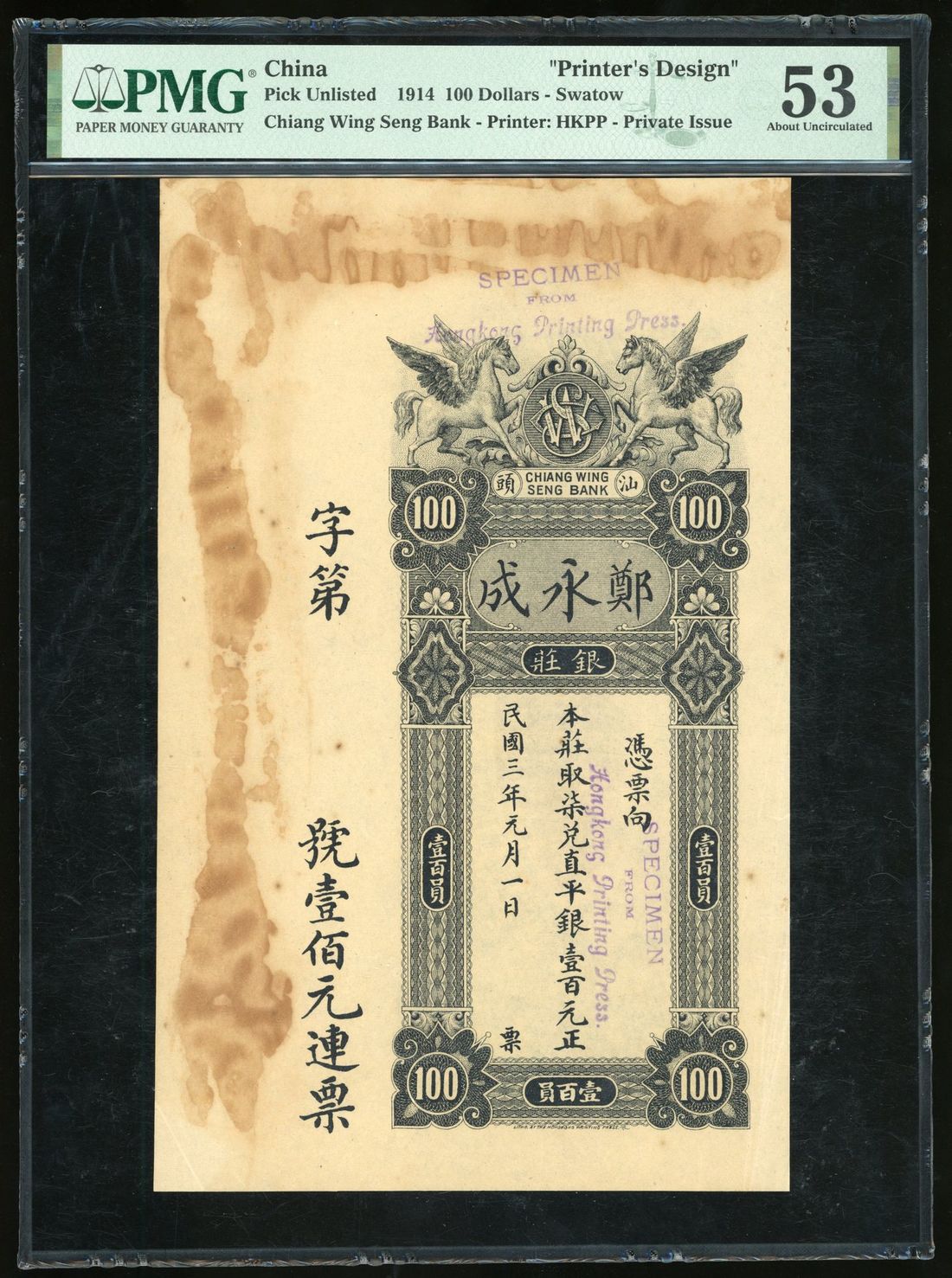 Chiang Wing Seng Bank, China, specimen $100, Swatow, 1914, vertical format, black, flying horses flanking the Bank's logo at upper centre, geometric designs within borders, reverse green and black, town street scene at centre, printed by Hong Kong Printing Press,