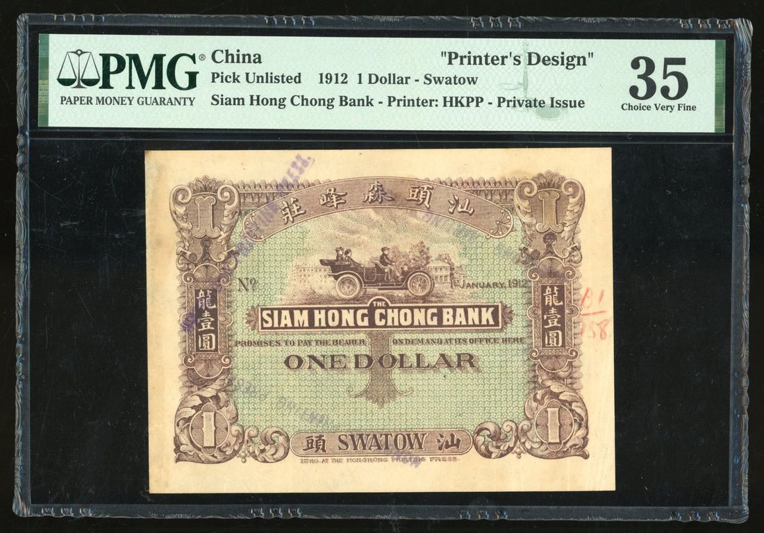 Siam Hong Chong Bank, China, $1 'Dragon Dollar', specimen, Swatow, 1.1.1912, printed by The Hong Kong Printing Press,