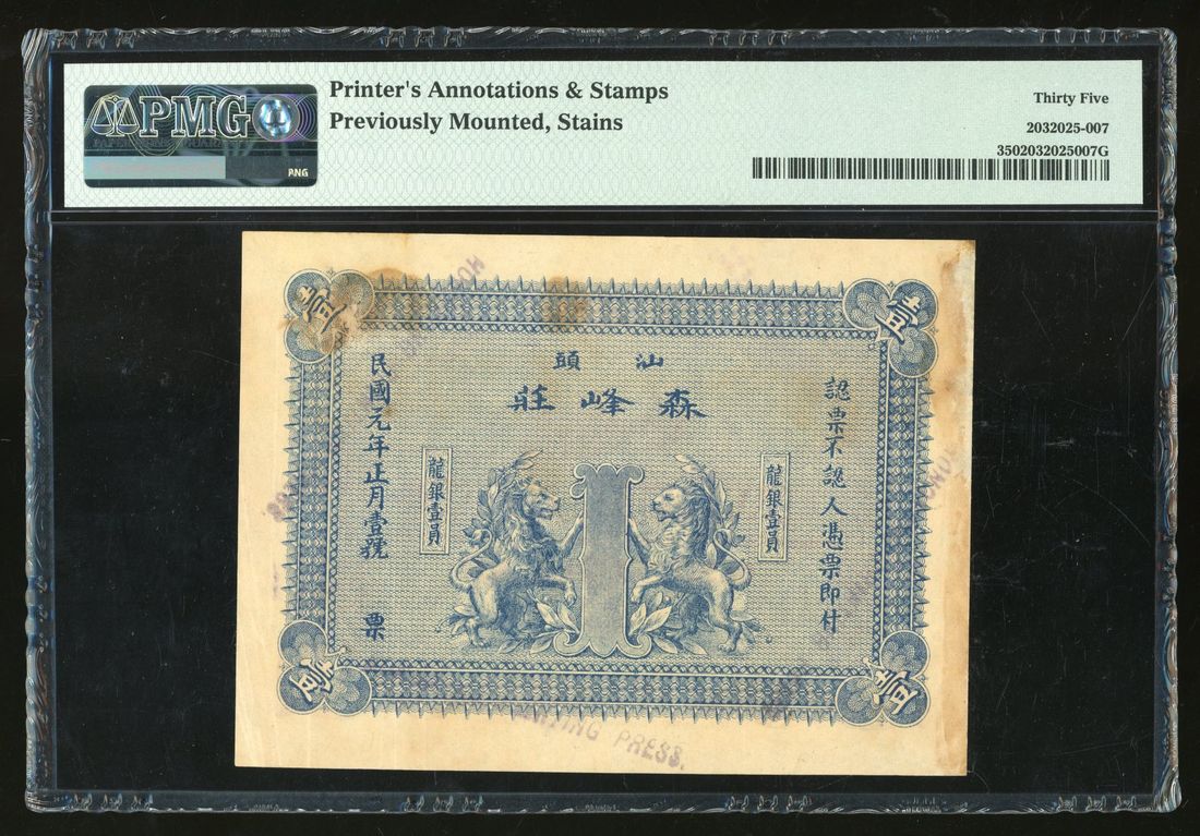 (Pick not listed), PMG 35 Choice Very Fine (Printer's Annotation and Stamp, Previously Mounted, Stains). The denomination is written as 'Dragon One Dollar' in reference to the silver dollars during the Qing Dynasty. Very unusual