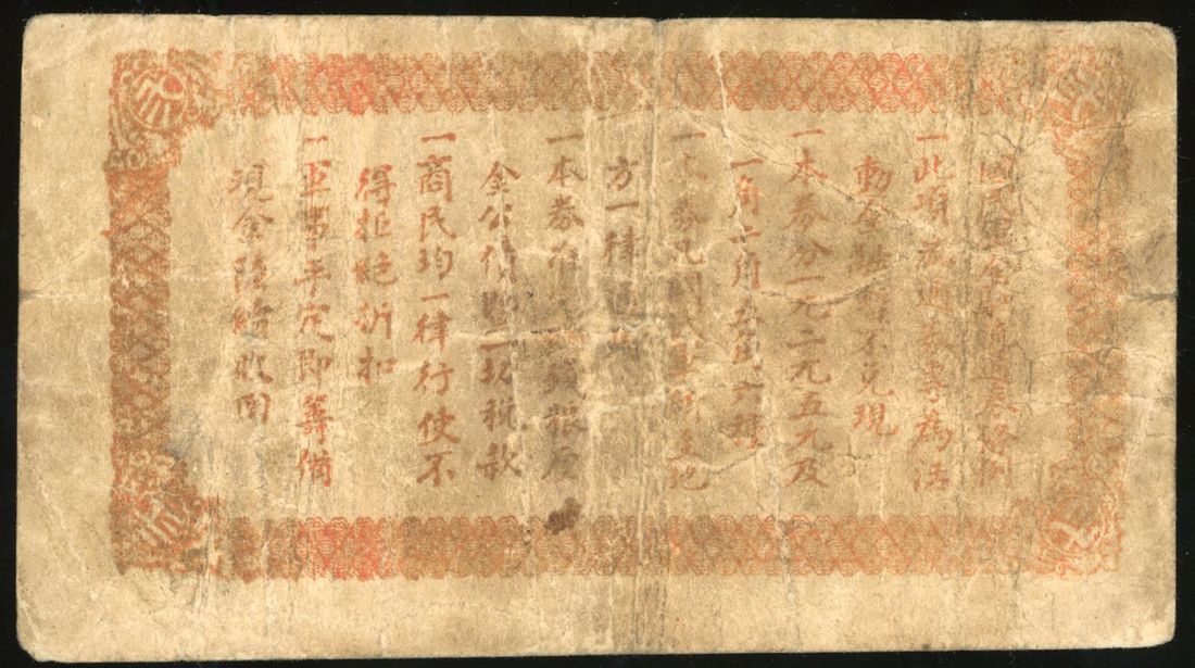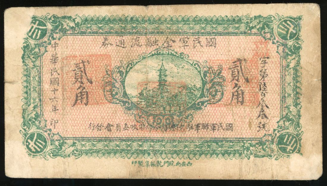 National Army Provisional Issue, 2 chiao, Year 16(1927), serial number 633, green, pagoda at centre,