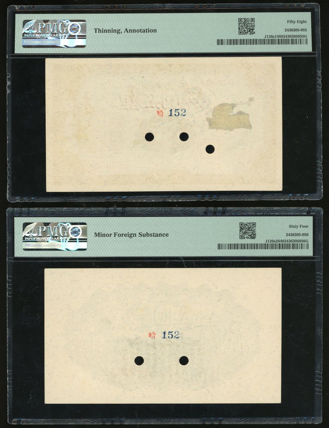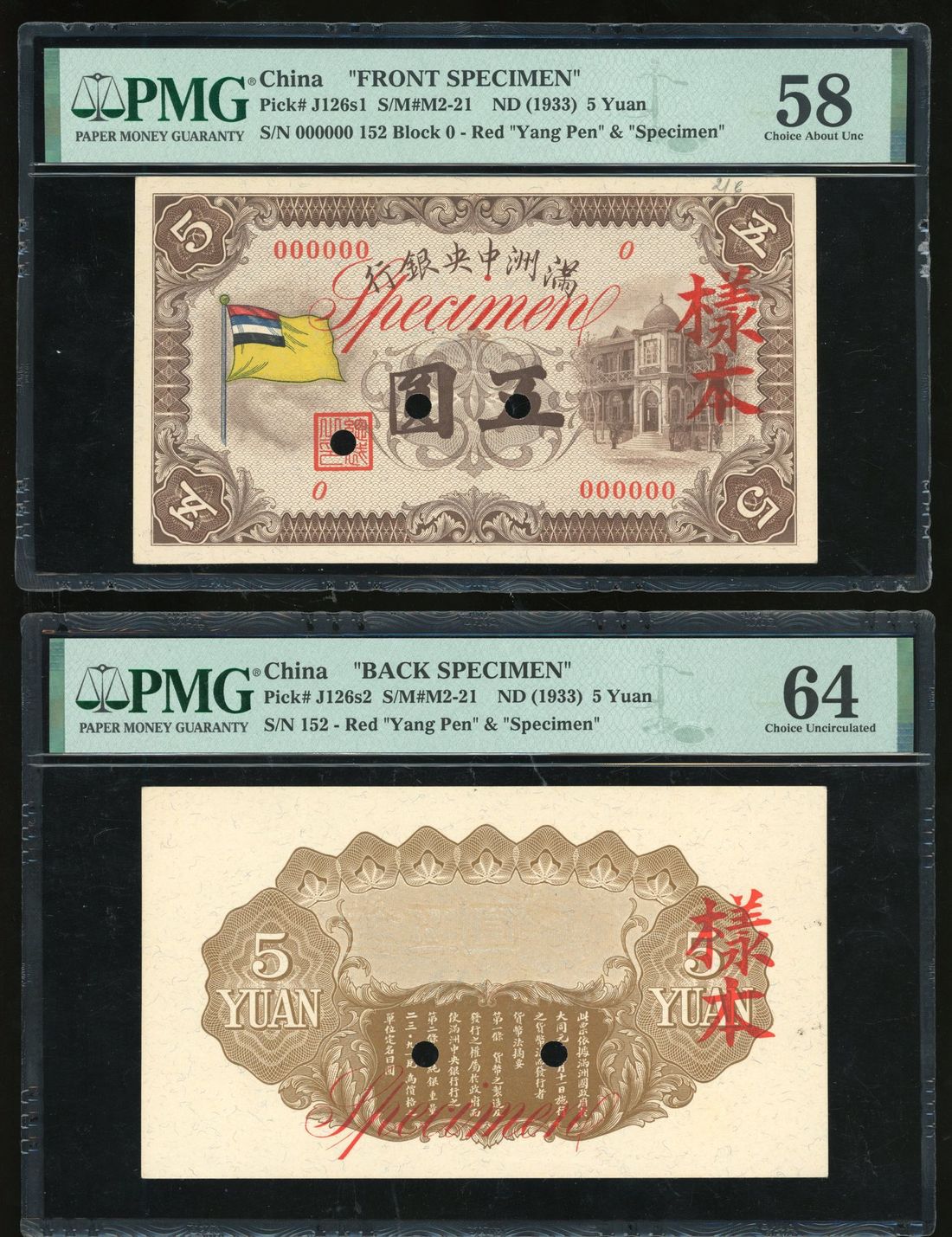 Centra Bank of Manchukuo, China, obverse and reverse uniface specimen 5 yuan, ND (1933), zero serial numbers, specimen number 152, (Pick J126s1, 2), PMG 58 (thinning, annotation), 64 (minor foreign substance) respectively. Scarcer than the higher denomination 10 yuan.
