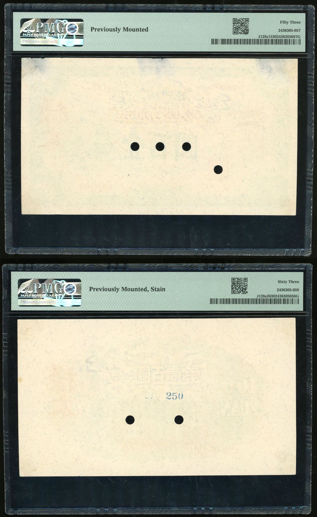 (Pick J128s1, 2), PMG 53 (previously mounted), 63 (previously mounted, stain) respectively. Highest denomination of the series. Scarce (2)