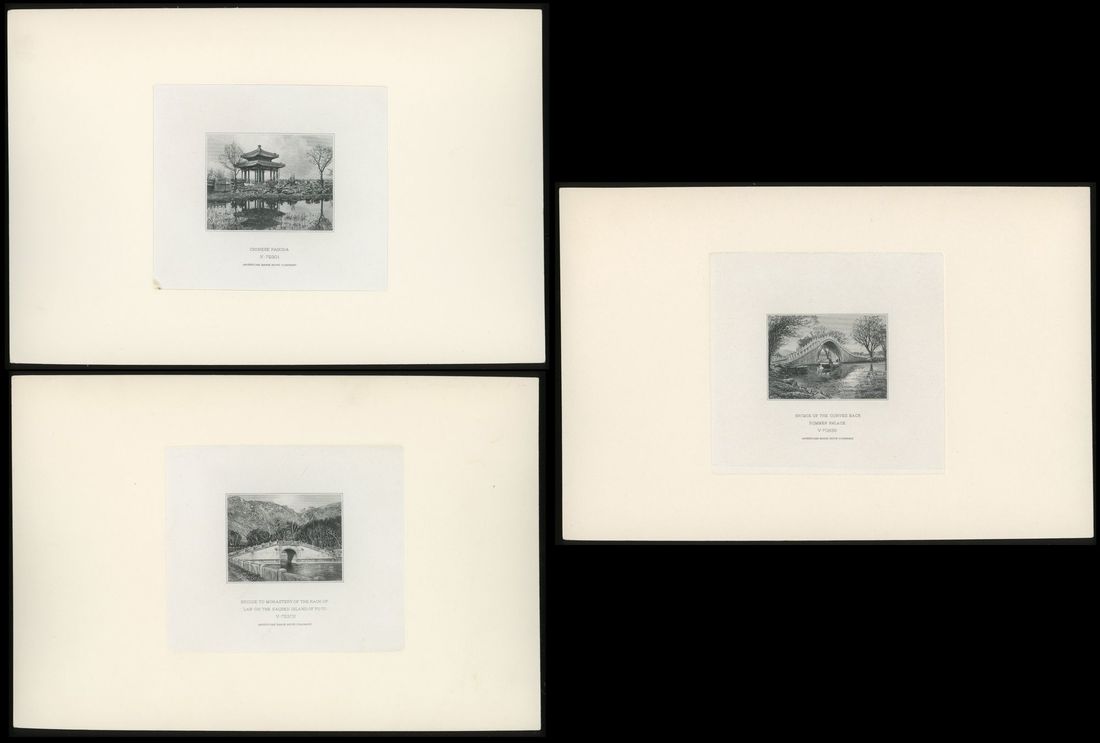 American Bank Note Company, China, group of 3x vignettes featuring bridges, titled: 'Houseboats on River with Building and Arched Bridge', 'Bridge of the Curved Back, Summer Palace' and 'Bridge To Monastery of the Rain of Law on the Sacred Island of Pu-To',