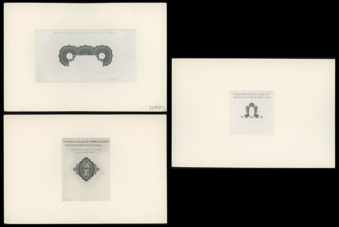 American Bank Note Company, China, a group of 3x vignettes, The National Industrial Bank of China, pattern similar to that which encloses the place name of issue on the 1931 5 Yuan; Hupeh Provincial Bank, 'Wu Yuan' Chinese denomination; Provincial Bank of Kwangsi, a partial pattern for the reverse of a 5 Yuan, likely of the 1929 issue,