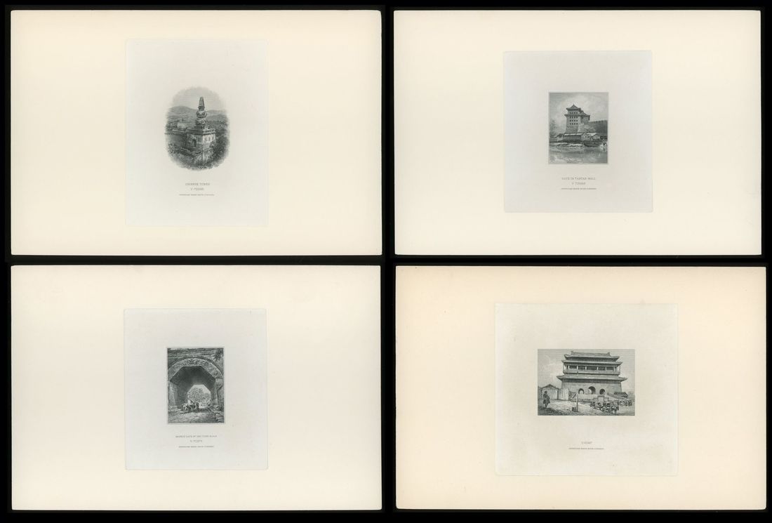American Bank Note Company, China, group of 4x vignettes, titled: 'Chinese Tower', 'Gate in Tartar Wall', 'Marble Gate at Chu Yung Kuan' and the fourth is untitled, but depicts a fortress gatehouse, carriages and a soldier figure at left,