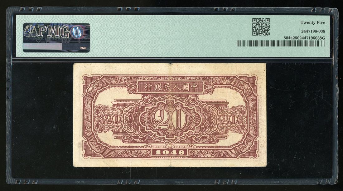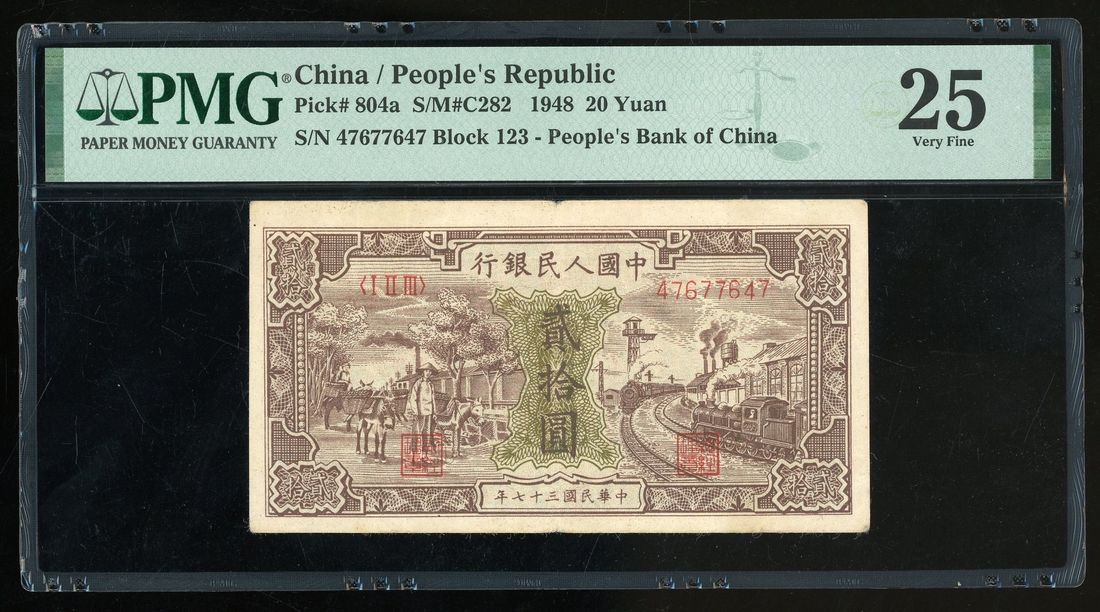 People's Bank of China, 1st Series Renminbi, 1948, 20 yuan, serial number I II III 47677647, "Donkey and Train",