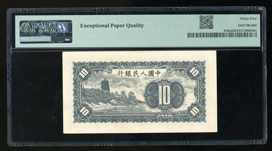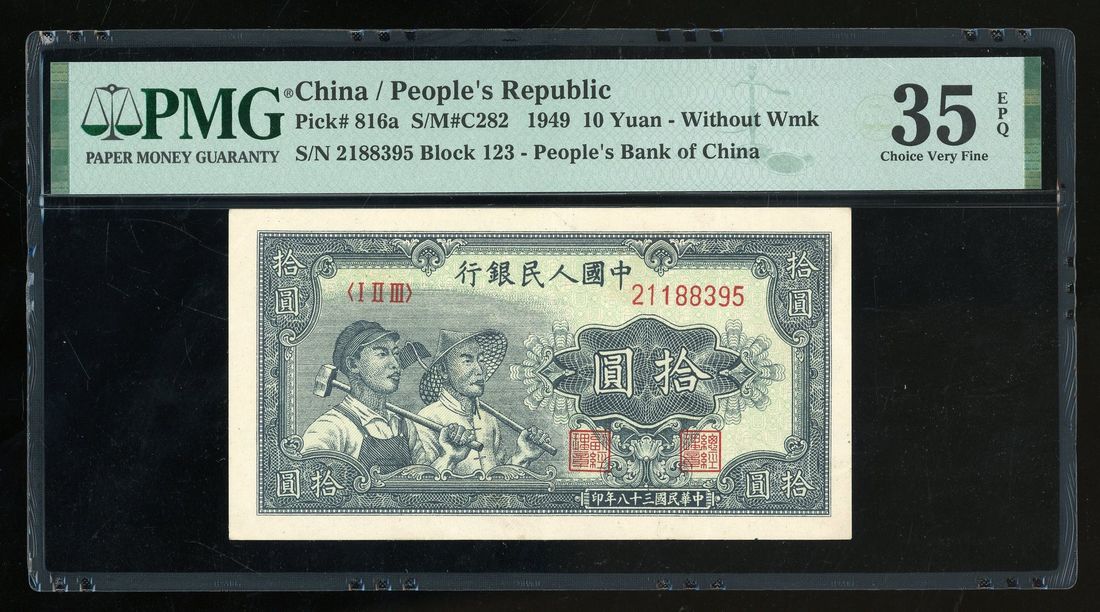 People's Bank of China, 1st Series Renminbi, 1949, 10 yuan, serial number I II III 2188395, "Farmer and Factory Worker",